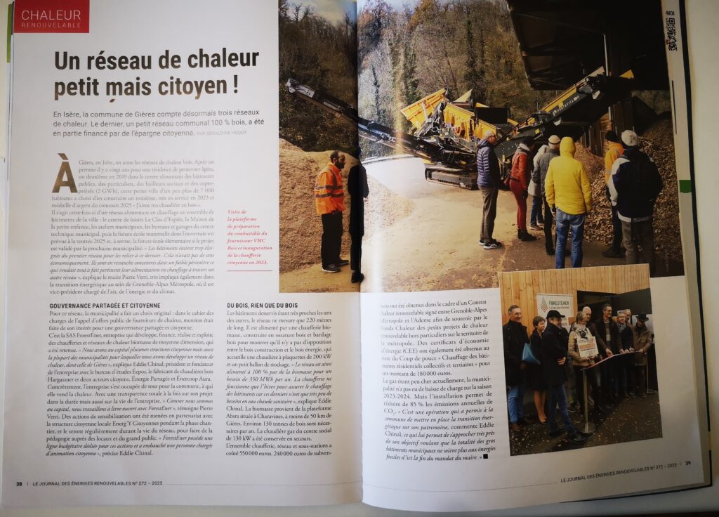 Actualités Septembre 2025 On parle nous dans le dernier numéro du Journal des ENERGIES RENOUVELABLES Mars 2025 Visite du chantier du réseau de chaleur de Mont Saint Vincent (71) 14 Février 2025 Notre chaufferie de Gières (38) sur le podium des coups de foudre du concours de "J'aime ma chaudière bois" avec une belle médaille d'argent ! Retrouvez tous les lauréats du Concours « J’aime ma chaudière bois » Février 2025 Visite du chantier du réseau de chaleur de Vif avec Energ'Y Citoyennes (38) Retour sur la visite de la chaufferie bois de Vif Février 2025 Visite du chantier du réseaux de chaleur partagée du Bourget-du-Lac (73) Novembre 2024 Profitez d’un programme qui réchauffe avec Energ’Y Citoyennes, Forestener, Grenoble Alpes Métropole et Seyssins. La plateforme bois de Charavines en images… Janvier 2023 Article presse - Réseau de chaleur Chapelle des Bois Une nouvelle réalisationinaugurée le 4 mai 2022 :le réseau de chaleur de Membrey (70) Article paru le 16 mai 2022 dans le journal L’Est Républicain Inauguration Membrey Mai 2022Inauguration MembreyInauguration MembreyInauguration MembreyInauguration Membrey
